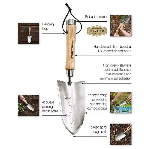 Why we love it:This attractive Kent & Stowe Hand Trowel is comfortable to hold and perfect for planting bulbs, seedlings and bedding around your borders and raised bedsMade from high quality stainless steel and beautiful ash wood