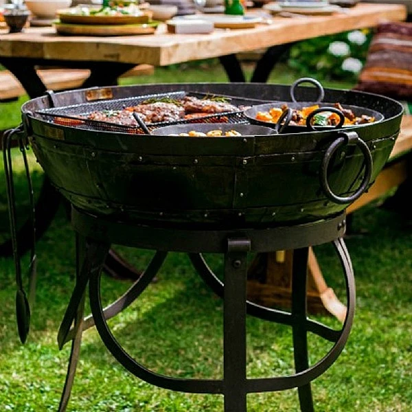 What you need to know:1 x Recycled Kadai Firebowl with High Stand, Low StandAvailable in 70cm and 80cm diameterMade from recycled oil drumsEvery recycled Kadai is fitted with Wilstone’s unique filter system for drainageDrop handles for easy manoeuvrability even when litLarge grilling area for variable heat