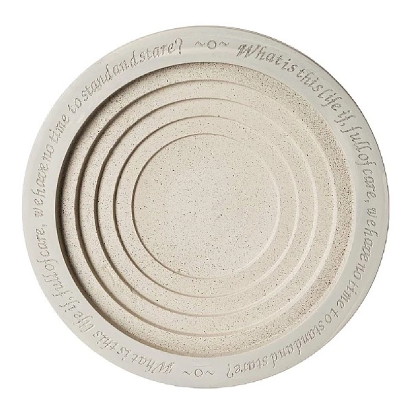- The bath comes with a short base section which raises it around 10cm above ground level. It is embossed around the rim with the opening lines from the W H Davies poem ‘Leisure’: ‘What is this life if, full of care, we have no time to stand and stare’
